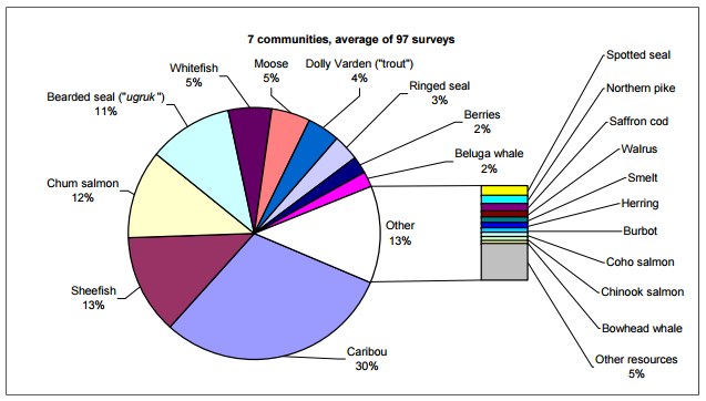 Most residents in the Kotzebue Sound Fisheries Management Area continue to participate in a mixed subsistence-cash economy, harvesting a variety of wild foods, just as they have done in recent centuries. During the time period 1980 to 2007, community populations in Northwest Alaska increased by 29%, with an estimated population in 2007 of 7,134 people, 3,113 of which (44%) lived in Kotzebue, while 4,001 (56%) lived in one of the 10 smaller communities of the area. Comprehensive subsistence harvest monitoring studies have been conducted in 7 of the 11 Kotzebue Sound area communities. Each community also has been surveyed at least once to develop estimates of big game harvests, and 6 communities had at least 10 years of annual fish harvest estimates. Comprehensive subsistence harvest information from 7 Kotzebue Sound area community studies demonstrated that on average subsistence harvests provided approximately 500 usable pounds wild food per person per year. These same research results indicate that the top 10 species of fish and wildlife harvested by area residents represent 87% of the total subsistence harvest in edible/usable pounds, including caribou (30%), sheefish (13%), chum salmon (12%), bearded seal ("ugruk")(11%), whitefishes (5%), moose (5%), Dolly Varden ("trout")(4%), ringed seal (3%), berries (2%), and beluga ("white") whale (2%). Other than caribou, no single resource contributed more than 13% to the estimated total (e.g., see below based upon Figure 35 from Magdanz et al. 2010).