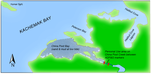 China Poot Bay is located approximately four miles southeast of the Homer Spit, across Kachemak Bay. There is no road access to China Poot Bay.