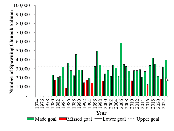 Chinook Salmon Research Initiative Copper River Chinook Salmon Overview HistoricalEscapement Publications Projects Copper River Historical Escapment Copper River spawning Chinook salmon from 1980 to 2023. Facebook Twitter Google+ Reddit