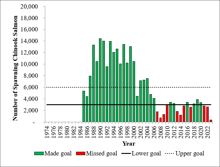 Chinook Salmon Research Initiative Karluk River Chinook Salmon Overview HistoricalEscapement Projects Karluk River Historical Escapment Karluk River spawning Chinook salmon from 1985 to 2023. Facebook Twitter Google+ Reddit