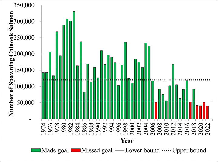 Chinook Salmon Research Initiative Nushagak River Chinook Salmon Overview HistoricalEscapement Publications Projects Nushagak River Historical Escapement Nushagak River spawning Chinook salmon from 1974 to 2023. Facebook Twitter Google+ Reddit