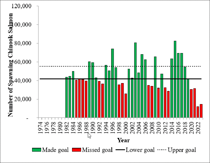 Chinook Salmon Research Initiative Yukon River Chinook Salmon Overview HistoricalEscapement Projects Publications Yukon River Historical Escapement Yukon River spawning Chinook salmon from 1982 to 2023. Facebook Twitter Google+ Reddit
