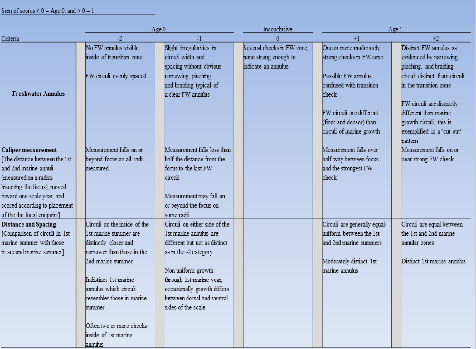 As a consequence of the diversity of possible origins of Chinook salmon in southeast Alaska waters and a concern about the subjectivity of interpreting scale growth patterns, Rowse et al. (1990) developed a table of Freshwater Age Criteria (Figure 1) to use as guideline for freshwater age estimation. In general, three scale characteristics are scored and summed, and the sum of the points indicates a freshwater age of 1 or 0. The three scale characteristics include: