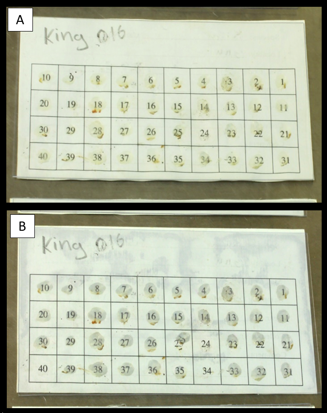 Scales must be moist to ensure good adhesion to the gummed card. Position moist scale directly over a number, and place each scale in a consistent orientation. Place the scale so that the rounded margin is up and at the same angle. Scales with inconsistent orientation increase amount of time needed to estimate age. Apply slight pressure with finger to ensure good bond with gummed card.
