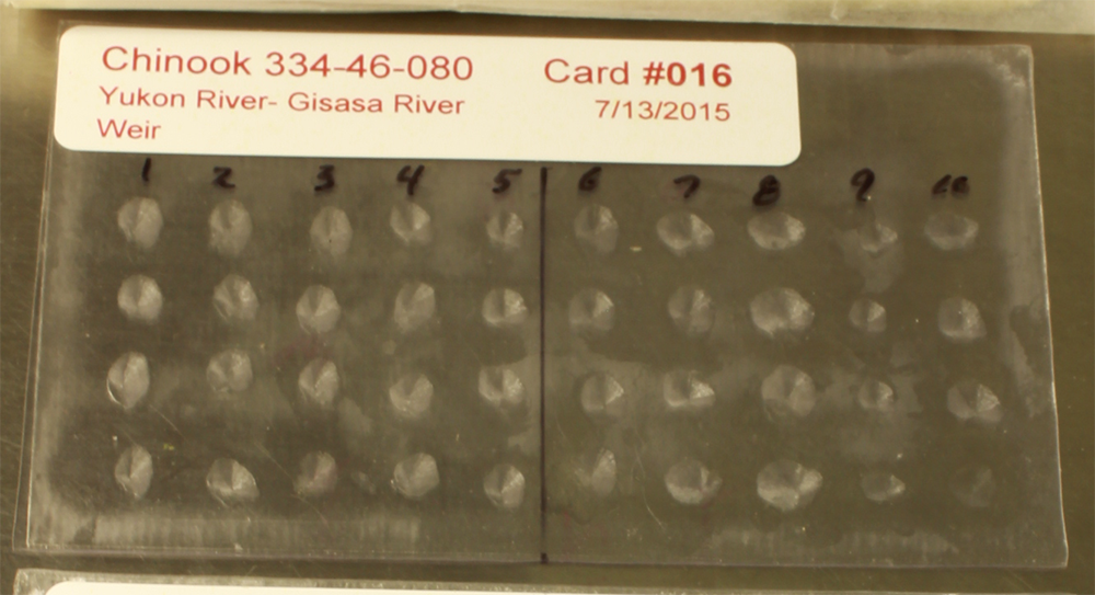 Typically, 3–4 scales are sampled per fish for Chinook salmon. Scales from the same fish are placed in a single column (see sample size and rate page). For typical gummed cards, this means there are 30-40 scales from 10 fish on each full gummed card.