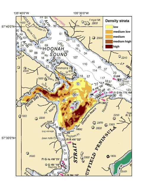 "The southeastern Alaska red king crab stock assessment survey provides an annual estimate of abundance and overall health of these stocks. The survey has historically sampled strata which are a mixture of both good and poor habitat, compromising the ability of directing pots to high abundance and variability strata. Geostatistical analyses were used to revise area stratification based upon the geographic distribution of previous survey catches, bathymetric data, and long-standing experience of industry. Nine survey areas were restratified into 5 abundance-based strata; Holkham Bay was restratified into 3 strata. From 22.4% to 44.0% of each survey area was designated as low abundance strata, averaging 30.4 %. A very small abundance of crab was expected in these strata. The remaining abundance estimates were assigned to the remaining four strata. Approximately 20%, 18%, and 14% of each area was designated as medium low, medium, medium high, and high abundance respectively.