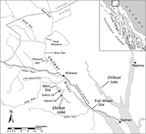 Chilkat Lake is located 30 kilometers northwest of the city of Haines, Alaska (Figures 1 and 2). It is a clear lake approximately 9 kilometers long with a maximum depth of 57 meters. The lake outlet, Clear Creek or Clear Water Slough, flows 0.5 kilometers to the Tsirku River, which then flows for approximately 5 kilometers to meet the Chilkat River. Periodic flow reversals occur when the flow from the Tsirku River overpowers the slough's output. In these events, the Tsirku's glacial waters travel up the slough and into the northern section of Chilkat Lake (Figure 3), and the slough and lake waters become turbid with glacial silt and experience dramatic drops in temperature.
