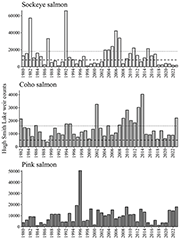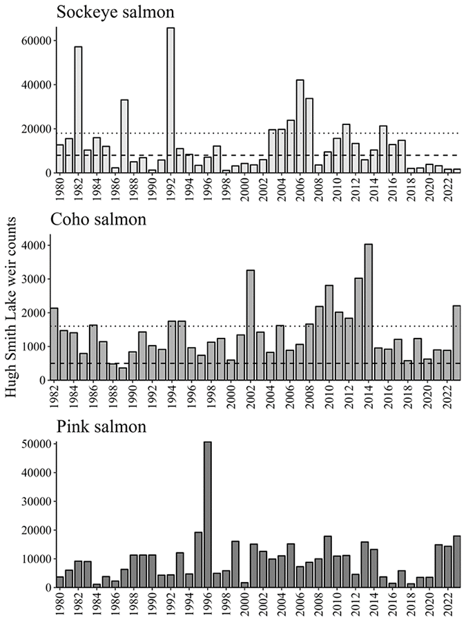 Historically, sockeye salmon return in the largest numbers (average 13,300; range 1,100–65,700), followed by pink (average 9,800; range 1,100–17,300) and coho (average 1,400; range 430–3,300) salmon, and chum salmon occur in small numbers (Figures 18 and 19). Hugh Smith Lake sockeye salmon have exceeded the lower bound of the escapement goal 52% of the time since 1980, with two major periods of weakness from 1998–2002 and 2018–present; the stock was listed as a stock of concern from 2003-2006. Hugh Smith Lake coho salmon have exceeded the lower bound of the escapement in all but 2 years from 1980 to present.
