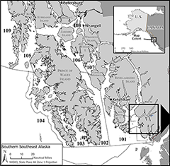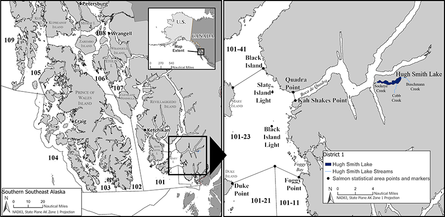Hugh Smith Lake, in Boca de Quadra Inlet, has been an important contributor to southern Southeast Alaska commercial fisheries for over a century. The Alaska Department of Fish and Game (ADF&G) has monitored adult salmon escapements through a weir at the outlet of Hugh Smith Lake from 1967 to 1971 and annually since 1980. In addition, smolt outmigration has been observed at a spring smolt weir operated annually since 1982. These population studies provide the longest time series of escapement and age, sex, and length information for sockeye and coho salmon in southern Southeast Alaska. Data collected on coho salmon allow this population to serve as an indicator stock used to evaluate existing biological escapement goals, monitor status, and estimate harvest and marine survival. Additionally, coho salmon fry have been implanted with half-length coded wire tags (CWTs) annually since 1997, which improves aging accuracy by establishing a known-age standard within each cohort. This project, along with the related Berners River coho salmon project, are the only known-age coho salmon projects in Alaska. In 2003, an optimal escapement goal of 8,000–18,000 sockeye salmon was set based on the escapement goal analysis outlined in Geiger et al. (2003). Shortly thereafter, in 2009 the current coho salmon biological escapement goal of 500–1,600 coho salmon was established, updating the previous escapement goal range.