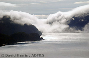 Fog rolling in over mountains into Cross Sound in Southeast Alaska