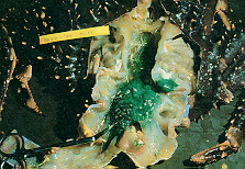 Green internal mass of same parasitic barnacle in viscera of a blue king crab.