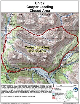 Area Description: Unit 7 the Cooper Landing Closed Area, which consists of that portion of Unit 7 bounded by Juneau Creek, beginning at its confluence with the Kenai River, then upstream to the confluence of Juneau Creek and Falls Creek, then easterly along Falls Creek and the north fork of Falls Creek and over the connecting saddle to Devils Creek, then southeasterly along Devils Creek to its confluence with Quartz Creek, then southwesterly along Quartz Creek to the Sterling Highway, then westerly along the Sterling Highway to the Kenai River, and then westerly along the Kenai River to the point of beginning at the mouth of Juneau Creek