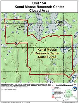 Area Description: Unit 15 the Kenai Moose Research Center Closed Area in Unit 15(A), which consists of that area within the outer boundary fences of the Kenai Moose Research Center, located west and south of Coyote and Vixen Lakes