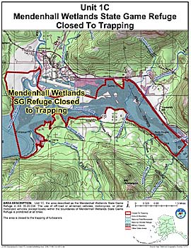Area Description: Unit 1(C) the area described as the Mendenhall Wetlands State Game Refuge in AS 16.20.034 is closed to trapping; the use of off-road or all-terrain vehicles, motorcycles, or other motorized vehicles (except boats) within the boundaries of Mendenhall Wetlands State Game Refuge is prohibited at all times