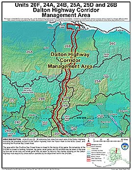 Area Description: Dalton Highway Corridor Management Area (DHCMA): the portions of Units 20 and 24-26 extending five miles from each side of the Dalton Highway, including the driveable surface of the Dalton Highway, from the Yukon River to the Arctic Ocean, and including the Prudhoe Bay Closed Area
