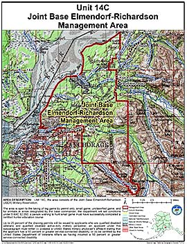 Restrictions: The area is open to the taking of big game by permit only; small game, unclassified game, and fur animals in areas designated by the base commander; the department will set conditions under 5 AAC 92.050; a person wishing to hunt small game must have successfully completed a certified hunter education course