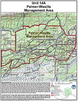 Area Description: Palmer-Wasilla Management Area: the area consists of that portion of Unit 14(A) bounded by a line beginning at the intersection of the George Parks Highway and the Glenn Highway, then east and north along the Glenn Highway to the Palmer Fishhook Road, then west and north along the Palmer Fishhook Road to the Faulk Road intersection, then west along the road and section line to Tex Al Drive and along Tex Al Drive to the Wasilla Fishhook Road, then south along the Wasilla Fishhook Road to Welch Road, then west along Welch Road to the south bank of the Little Susitna River, then west along the south bank of the Little Susitna River to the bridge at North Shushana Drive, then south along North Shushana Drive to Shrock Road, then west along Shrock Road to Church Road, then south along Church Road to the George Parks Highway, then west along the George Parks Highway to Vine Road, then south along Vine Road to Knik Goose Bay Road, then north along Knik Goose Bay Road to Fairview Loop Road, then south and east along Fairview Loop Road to the George Parks Highway, then east along the George Parks Highway to the intersection with the Glenn Highway