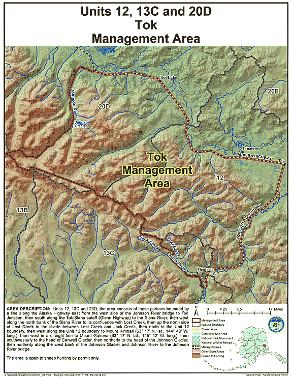 - Area Description: Tok Management Area: the area consists of those portions of Units 12, 13(C), and 20(D) bounded by a line along the Alaska Highway east from the west side of the Johnson River bridge to Tok Junction, then south along the Tok-Slana cutoff (Glenn Highway) to the Slana River; then west along the north bank of the Slana River to its confluence with Lost Creek, then up the north side of Lost Creek to the divide between Lost Creek and Jack Creek, then north to the Unit 12 boundary, then west along the Unit 12 boundary to Mount Kimball (63° 17' N. lat., 144° 40' W. long.), then west in a straight line to Mount Gakona (63° 17' N. lat., 145° 12' W. long.), then southwesterly to the head of Canwell Glacier, then northerly to the head of the Johnson Glacier, then northerly along the west bank of the Johnson Glacier and Johnson River to the Johnson River bridge