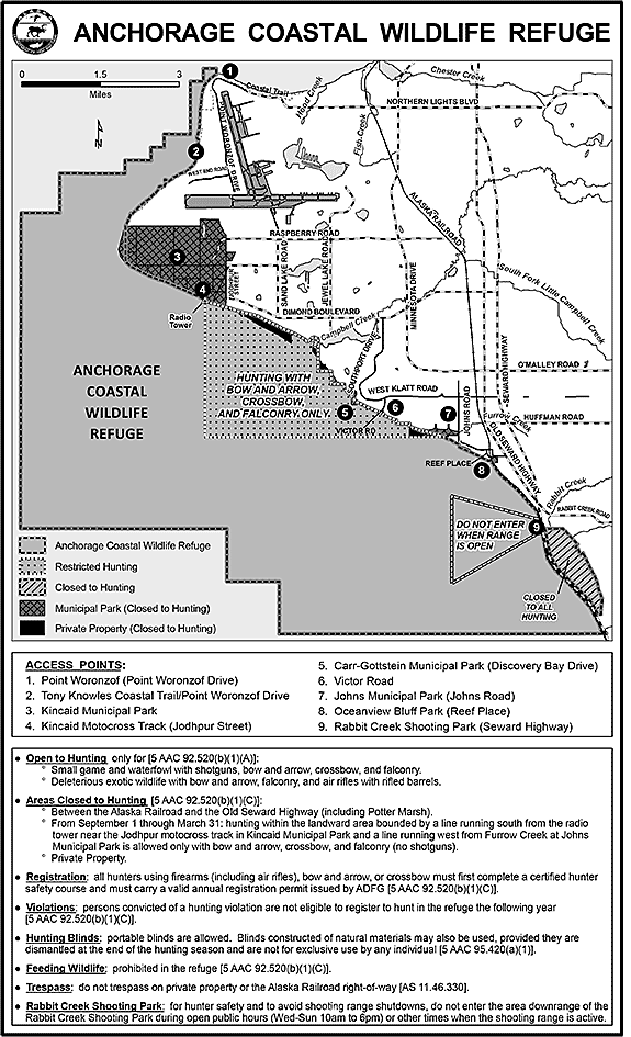 C. closed to the discharge of all firearms except that shotguns may be used in those areas open to hunting north and west of a line extending south from the radio tower located at the Kincaid Park motorcross area and south and east of a line extending from an ADF&G regulatory marker at the point where Furrow Creek enters the refuge through a second ADF&G regulatory marker west of Furrow Creek from September 1 through March 31; before hunting, a person wishing to hunt with a shotgun, air rifle with a rifled barrel, bow and arrow, or crossbow must complete a certified hunter safety course and must register annually with the department; a person convicted of a hunting violation in one year is not eligible to register to hunt in the Anchorage Coastal Wildlife Refuge the following year; a hunter using a shotgun shall present in the field, upon request, the registration permit; in addition, a person may not intentionally distribute bread scraps, cereal grains, corn, or other waterfowl foods, or otherwise feed waterfowl or other wildlife, except for authorized management purposes. - View Map: GIF Map (93 K) PDF Map (460 K)