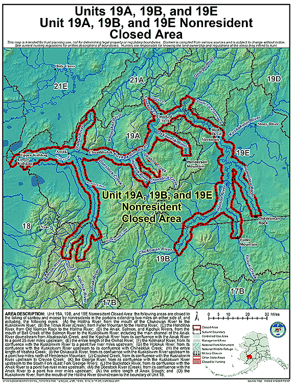 - Area Description: Units 19(A), 19(B), and 19(E) Nonresident Closed Area: the following areas are closed to the taking of caribou and moose by nonresidents in the portions extending two miles on either side of, and including, the following rivers:
