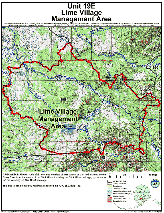 - Area Description: Lime Village Management Area: the area consists of that portion of Unit 19(E) drained by the Stony River from the mouth of the Stink River, including the Stink River drainage, upstream to but not including the Can Creek drainage