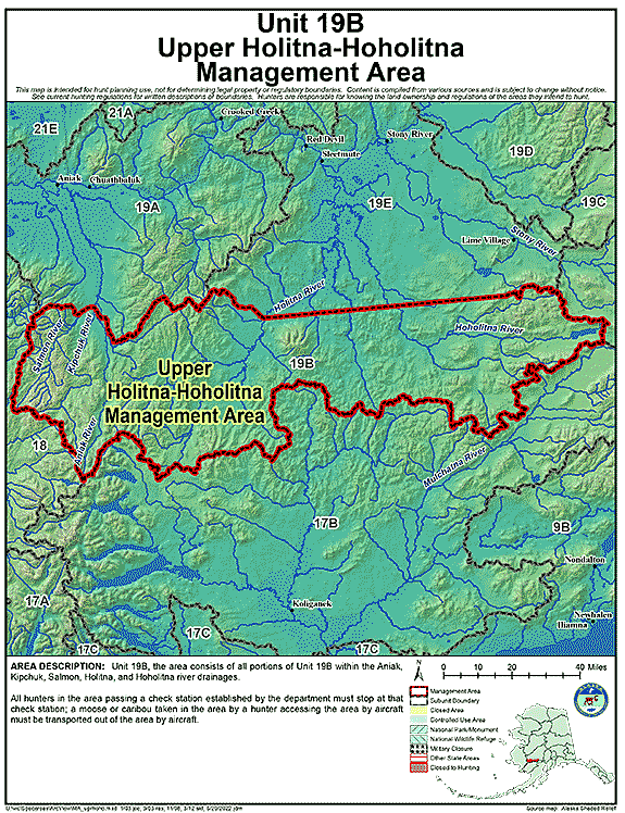 - Area Description: Upper Holitna-Hoholitna Management Area: the area consists of all portions of Unit 19(B) within the Aniak, Kipchuk, Salmon, Holitna and Hoholitna river drainages