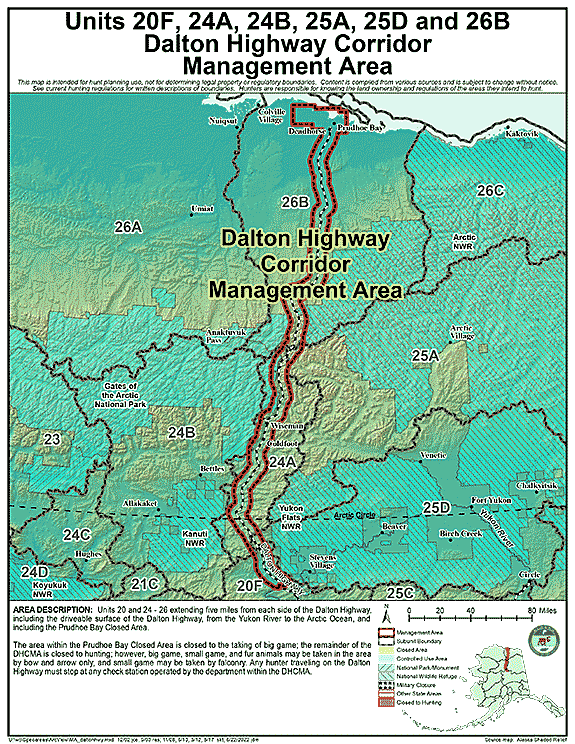 - Area Description: Dalton Highway Corridor Management Area (DHCMA): the portions of Units 20 and 24-26 extending five miles from each side of the Dalton Highway, including the driveable surface of the Dalton Highway, from the Yukon River to the Arctic Ocean, and including the Prudhoe Bay Closed Area