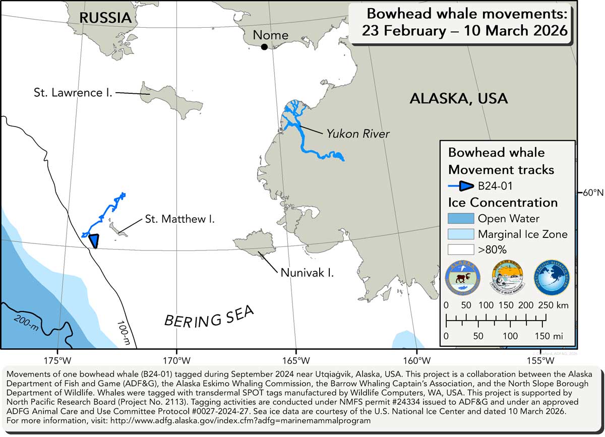 From 23 February – 10 March 2026, we received locations from one tag deployed on a bowhead whale. Bowhead B24-01 remains in the central Bering Sea, near St. Matthew Island, in heavy sea ice. Sea ice data are courtesy of the U.S. National Ice Center and dated 10 March 2026.