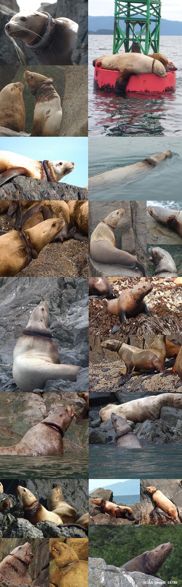 Fish & Game biologists have been photographing sea lions entangled in marine debris during the course of our vital rates research. Plastic packing bands are the most common identifiable neck entangling material, followed by rubber bands, net, rope, and monofilament line.
