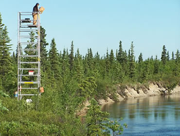 Counting towers are installed alongside clearwater streams to provide an unobstructed view of migrating fish. Every summer, ADF&G hires technicians to count salmon throughout the state using counting towers. Generally, a technician counts fish for 10 minutes each hour on each side of the stream. This number is then extrapolated to represent a full hour. A team of technicians will monitor the tower in this manner 24 hours a day seven days a week for the entire season. Counting towers have minimal equipment costs and provide reliable counts, but only work in clear, shallow streams where fish swim close to shore and are highly visable.