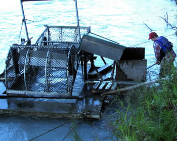 Estimating the abundance of a particular species of salmon in a river is easiest when they are not mixed with other fish species. Since sonar cannot identify fish by species, almost all Alaska Department of Fish and Game sonar sites use either gillnets or fish wheels to separate sonar-detected fish by species. At the Crescent River sonar site, ADF&G uses a fish wheel. A fish wheel scoops fish out of the river with large baskets and deposits them into a live box. The relative proportion of sockeye salmon to other species caught is examined to determine how many of the sonar-detected fish should be counted as sockeye salmon. Typically for the first few weeks of the season salmon migrating up the Crescent River are almost entirely sockeye. A small number of chum and pink salmon begin to arrive in mid July and larger numbers of chum begin to arrive around the first of August.