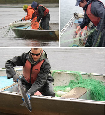 Throughout the field season, sonar site crew drift gillnets for two or three periods each day. During each period, the crew drift three nets—each with a different mesh size—several times along each side of the river until they have completed a total of 12 drifts. Fisheries biologists, then examine the proportion of each species in the gillnet catches to determine how many of the sonar-detected fish should be counted as sockeye, king and chum salmon. The crew drift the inriver gillnets just downstream of the sonar transducers so that the catches closely represent the fish passing though the sonar beam. The gillnet crew use buoys marking sonar transducer detection ranges to determine where to drift nets.