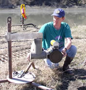 To deploy a split-beam sonar transducer, sonar site technicians mount the transducer to a tripod and submerge it near shore. They then aim the transducer sonar beam offshore and perpendicular to the river’s current along a section of the river bottom with a smooth, uniform slope. They must aim the transducer beam close enough to the river bottom so that fish cannot swim below it undetected, but high enough so that contact with river bottom does not disrupt detection of fish echoes with acoustical noise.