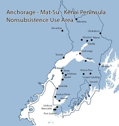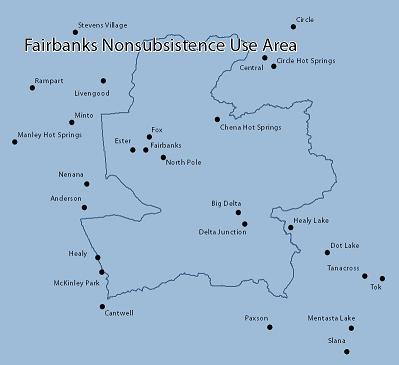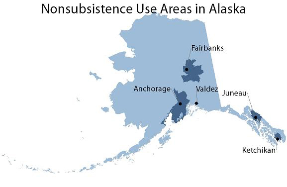 Most of the areas immediately around Anchorage, Fairbanks, and Juneau have been designated as nonsubsistence areas by the Joint Board of Fisheries and Game. In addition, areas around Ketchikan and Valdez have been designated as nonsubsistence areas.