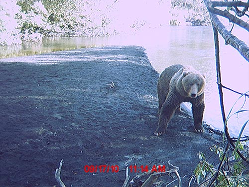 ADF&G wildlife technician Jeff Jemison aimed a remote trail camera at the carcass of a dead moose north of Juneau in the spring of 2010 and drew in a bear that had recently emerged from hibernation.
