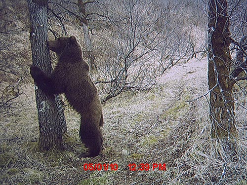 ADF&G wildlife technician Jeff Jemison aimed a remote trail camera at the carcass of a dead moose north of Juneau in the spring of 2010 and drew in a bear that had recently emerged from hibernation. -