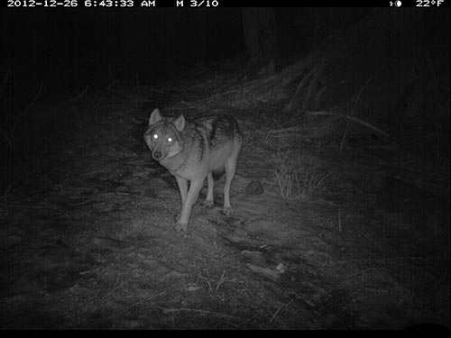In December 2012, Olivia Fletcher of Juneau began a science fair project looking at red squirrel habitat use and preferences. Two USFWS scientists helped mentor her work, and provided a remote, motion-triggered trail camera for the study. While she did get some pictures of squirrels, she captured some surprising images of wolves in the forest adjacent to downtown Juneau. The infra-red flash renders the images in black and white.