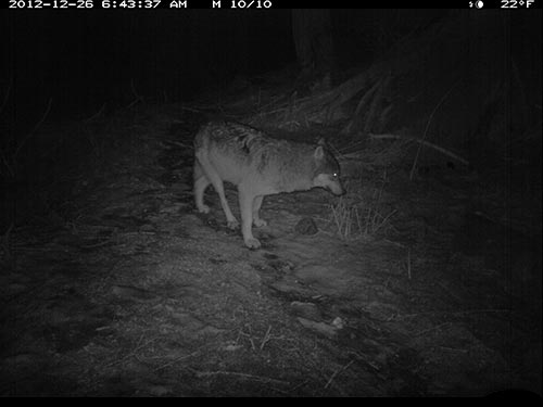 In December 2012, Olivia Fletcher of Juneau began a science fair project looking at red squirrel habitat use and preferences. Two USFWS scientists helped mentor her work, and provided a remote, motion-triggered trail camera for the study. While she did get some pictures of squirrels, she captured some surprising images of wolves in the forest adjacent to downtown Juneau. The infra-red flash renders the images in black and white.