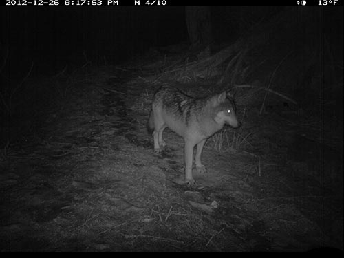 In December 2012, Olivia Fletcher of Juneau began a science fair project looking at red squirrel habitat use and preferences. Two USFWS scientists helped mentor her work, and provided a remote, motion-triggered trail camera for the study. While she did get some pictures of squirrels, she captured some surprising images of wolves in the forest adjacent to downtown Juneau. The infra-red flash renders the images in black and white.