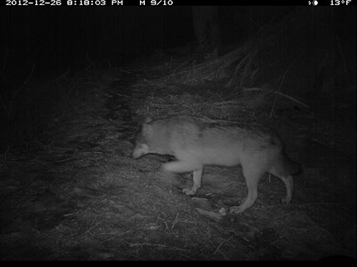 In December 2012, Olivia Fletcher of Juneau began a science fair project looking at red squirrel habitat use and preferences. Two USFWS scientists helped mentor her work, and provided a remote, motion-triggered trail camera for the study. While she did get some pictures of squirrels, she captured some surprising images of wolves in the forest adjacent to downtown Juneau. The infra-red flash renders the images in black and white.