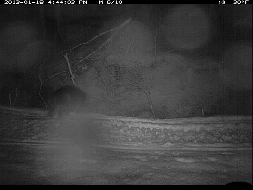Jan. 18, 2013, 4:44 pm, different location, porcupine crosses road and ambles over a snow berm away from camera.
