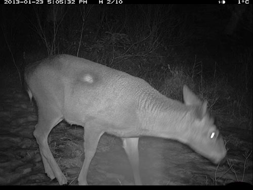 Jan. 23, 5 pm, different location, Black-tailed deer crosses in front of camera, has an odd white spot or patch on ride side.