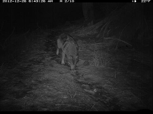 In December 2012, Olivia Fletcher of Juneau began a science fair project looking at red squirrel habitat use and preferences. Two USFWS scientists helped mentor her work, and provided a remote, motion-triggered trail camera for the study. While she did get some pictures of squirrels, she captured some surprising images of wolves in the forest adjacent to downtown Juneau. The infra-red flash renders the images in black and white.