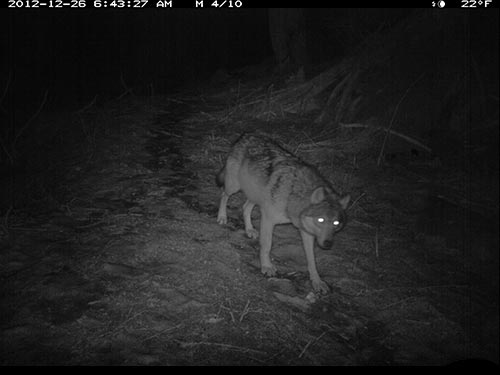 In December 2012, Olivia Fletcher of Juneau began a science fair project looking at red squirrel habitat use and preferences. Two USFWS scientists helped mentor her work, and provided a remote, motion-triggered trail camera for the study. While she did get some pictures of squirrels, she captured some surprising images of wolves in the forest adjacent to downtown Juneau. The infra-red flash renders the images in black and white.