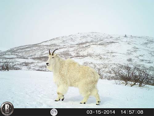 Robin Overall of Kodiak is an avid and skilled trail camera photographer. She shared nine pictures taken on Kodiak, all but one in the spring of 2014. Mountain goats are not native to Kodiak but were introduced in the 1950s and have flourished. Read more about Kodiak Island Mountain Goats at Alaska Fish and Wildlife News.