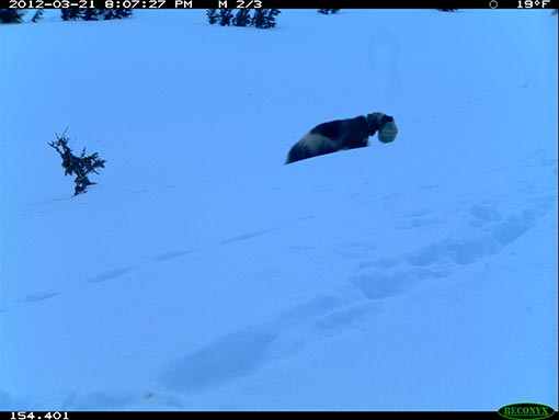 A trail camera image of a female wolverine moving her kit to a new den. The following two images, taken at night with infra-red, show the same female with the kit in her mouth approaching the entrance to a den.