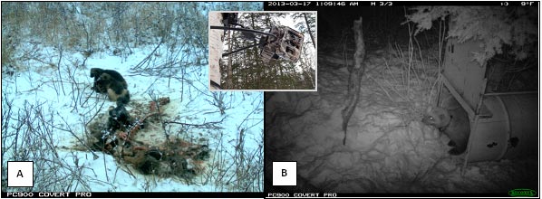 ADF&G biologists are monitoring animal activity at the site of wolverine live traps and documenting some unexpected visitors, including marten and brown bear. -