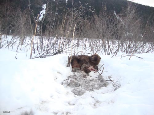 ADF&G wildlife technician Jeff Jemison aimed a remote trail camera at the carcass of a dead moose north of Juneau in the spring of 2010 and drew in a bear that had recently emerged from hibernation. -