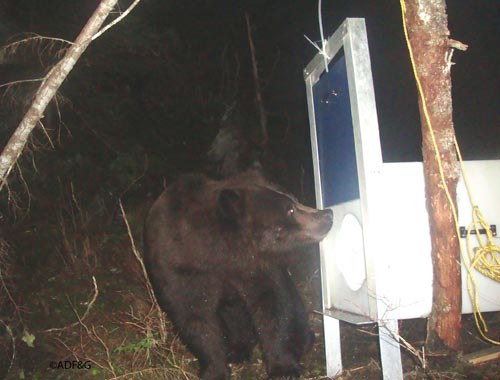 ADF&G wildlife technician Jeff Jemison aimed a remote trail camera at the carcass of a dead moose north of Juneau in the spring of 2010 and drew in a bear that had recently emerged from hibernation. -