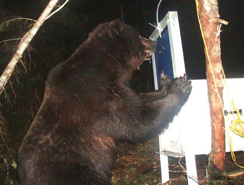 ADF&G wildlife technician Jeff Jemison aimed a remote trail camera at the carcass of a dead moose north of Juneau in the spring of 2010 and drew in a bear that had recently emerged from hibernation.